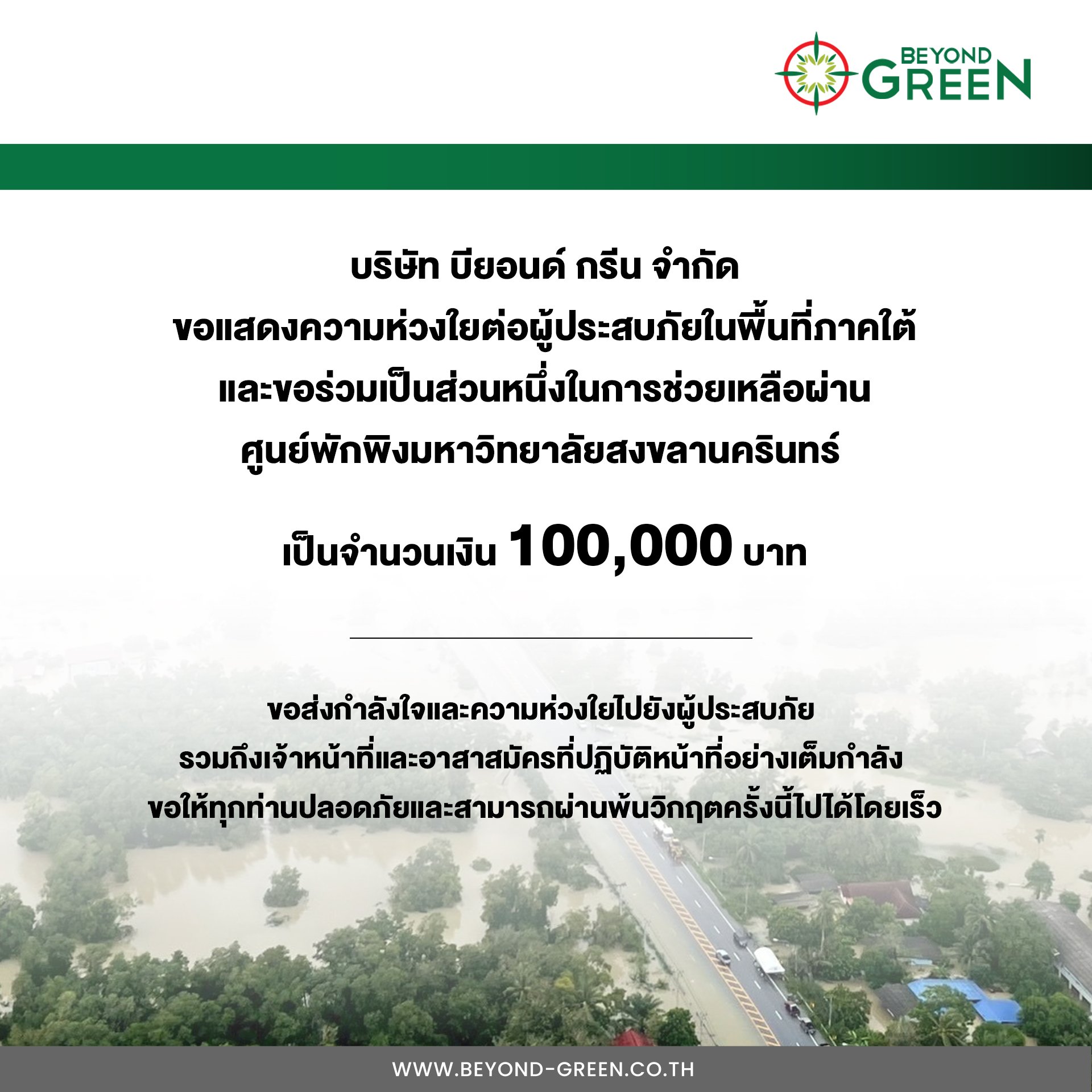 บริษัท บียอนด์ กรีน จำกัด ขอแสดงความห่วงใยต่อผู้ประสบภัยในพื้นที่ภาคใต้ และขอร่วมเป็นส่วนหนึ่งในการช่วยเหลือผ่านศูนย์พักพิงมหาวิทยาลัยสงขลานครินทร์ เป็นจำนวนเงิน 100,000 บาท