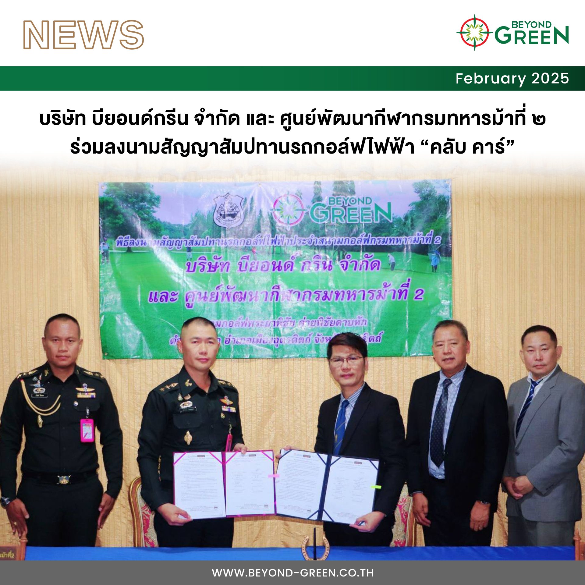 บริษัท บียอนด์กรีน จำกัด (สาขาพิษณุโลก) และศูนย์พัฒนากีฬากรมทหารม้าที่ ๒ ร่วมลงนามสัญญาสัมปทานรถกอล์ฟไฟฟ้า "คลับ คาร์"