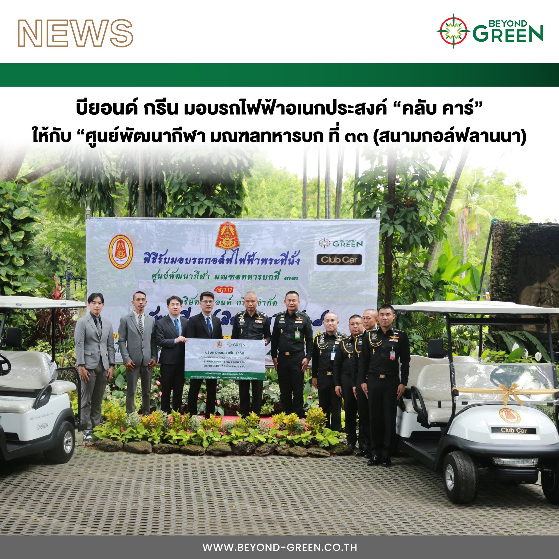 บริษัท บียอนด์ กรีน จำกัด โดยคุณอมฤต สุวรรณเศวต ประธานเจ้าหน้าที่บริหาร ได้มอบหมาย คุณดนัยวัชต์ แดงดี ผู้จัดการอาวุโสสำนักประธานเจ้าหน้าที่บริหาร และทีมงานสาขาเชียงใหม่ เป็นตัวแทนมอบรถไฟฟ้าอเนกประสงค์ Club Car รุ่น Precedent ขนาด 4 ที่นั่ง จำนวน 1 คัน และขนาด 6 ที่นั่ง จำนวน 1 คัน ให้กับศูนย์พัฒนากีฬา มณฑลทหารบกที่ ๓๓ (สนามกอล์ฟลานนา)
